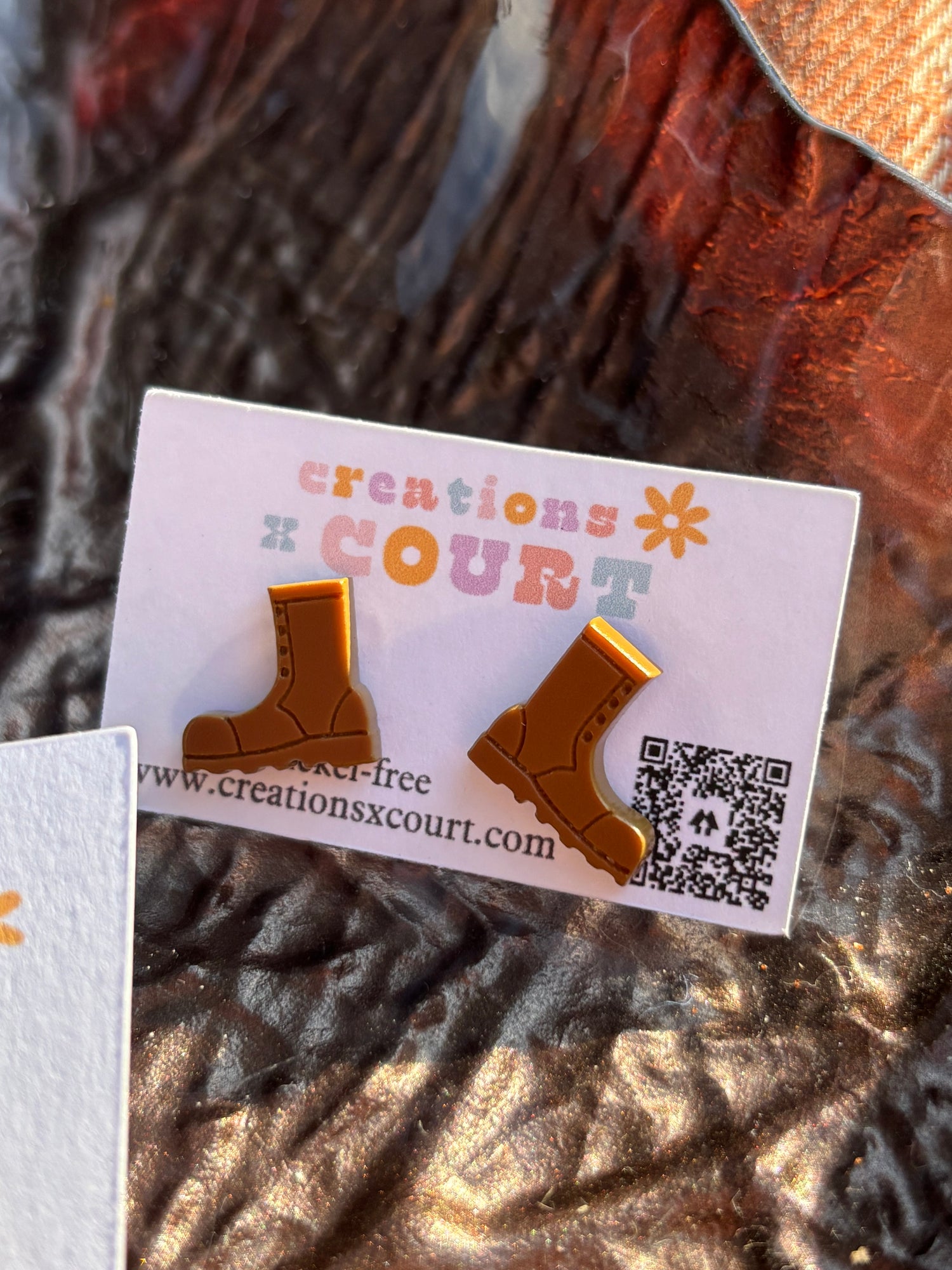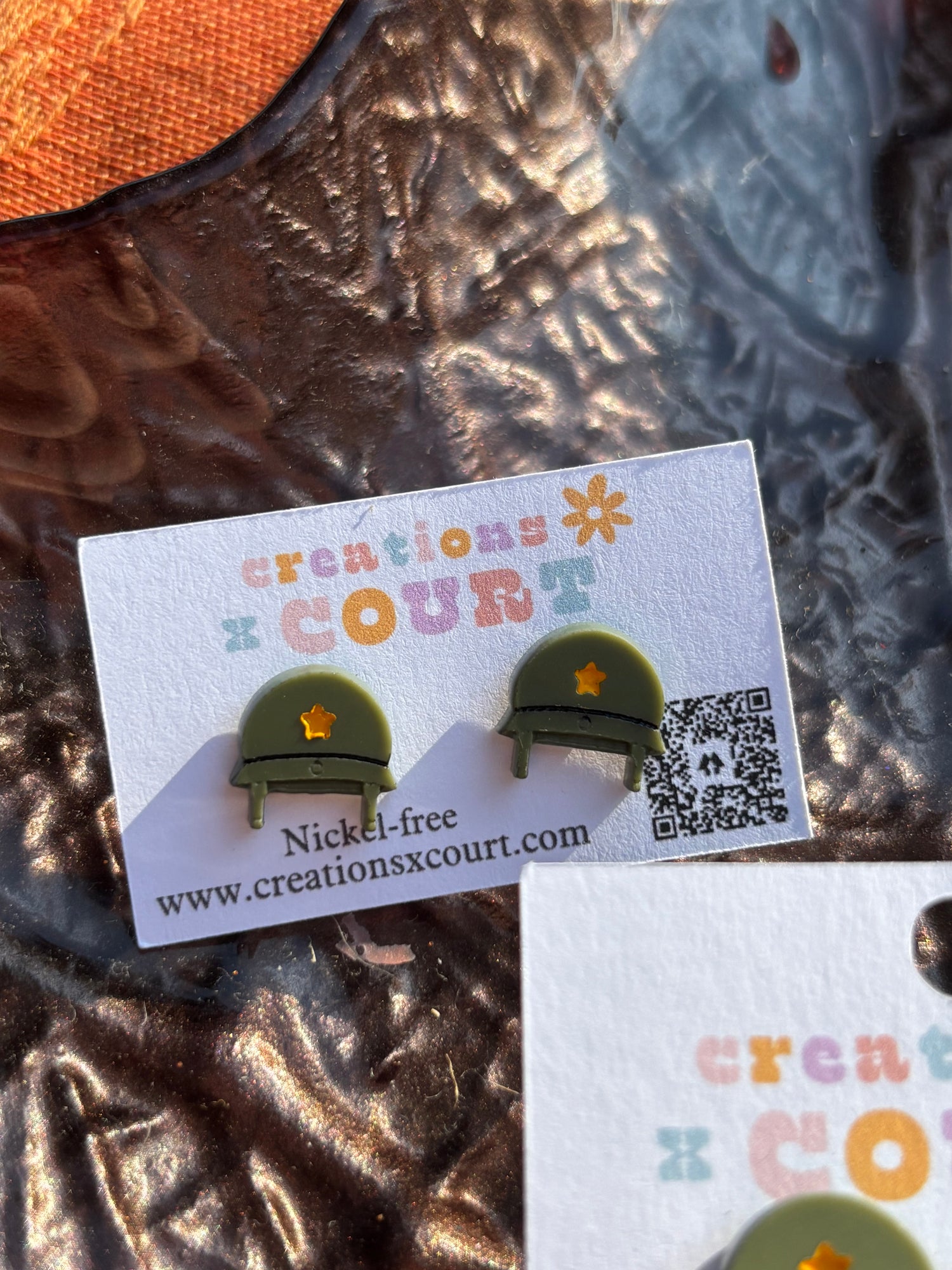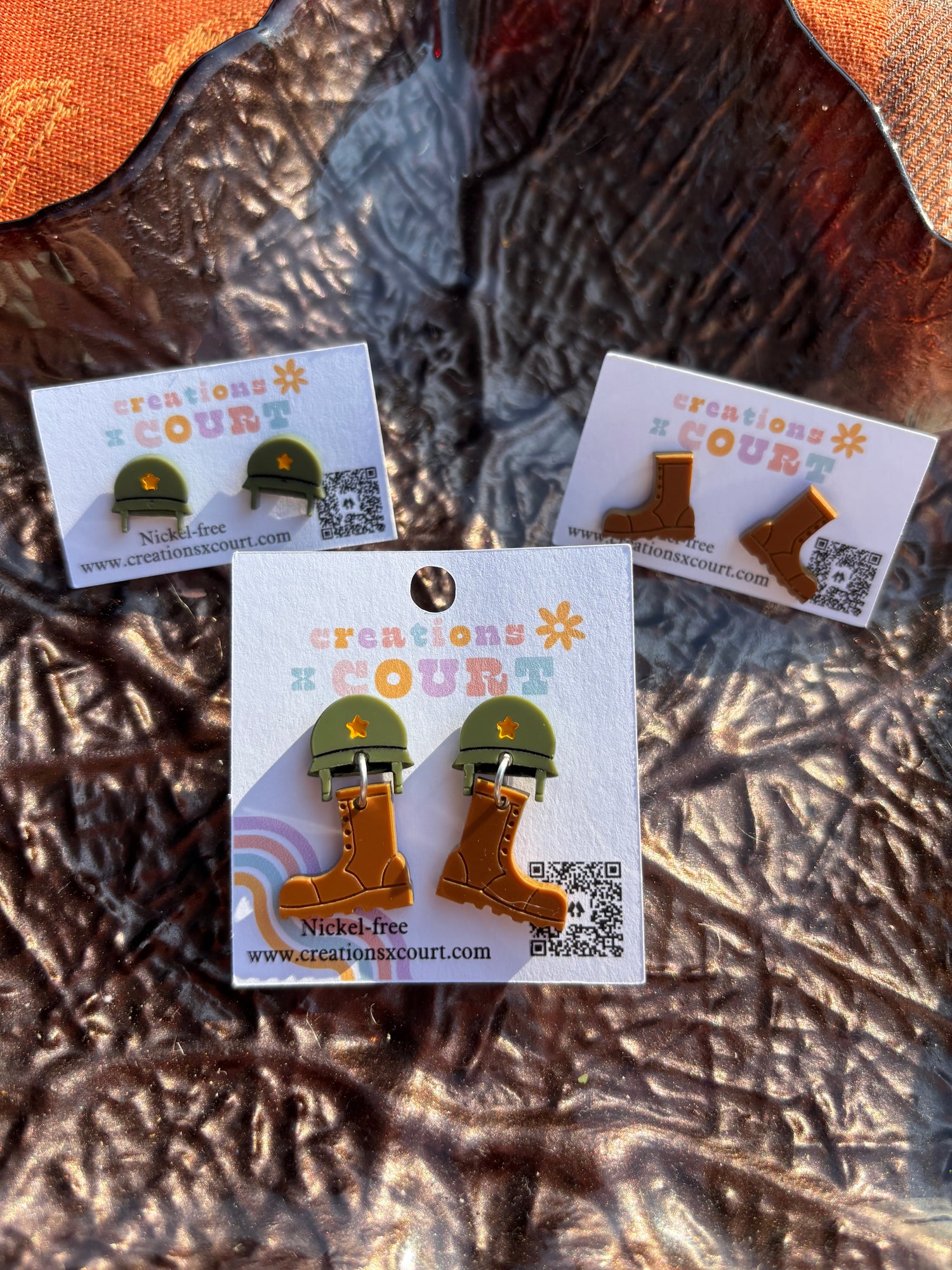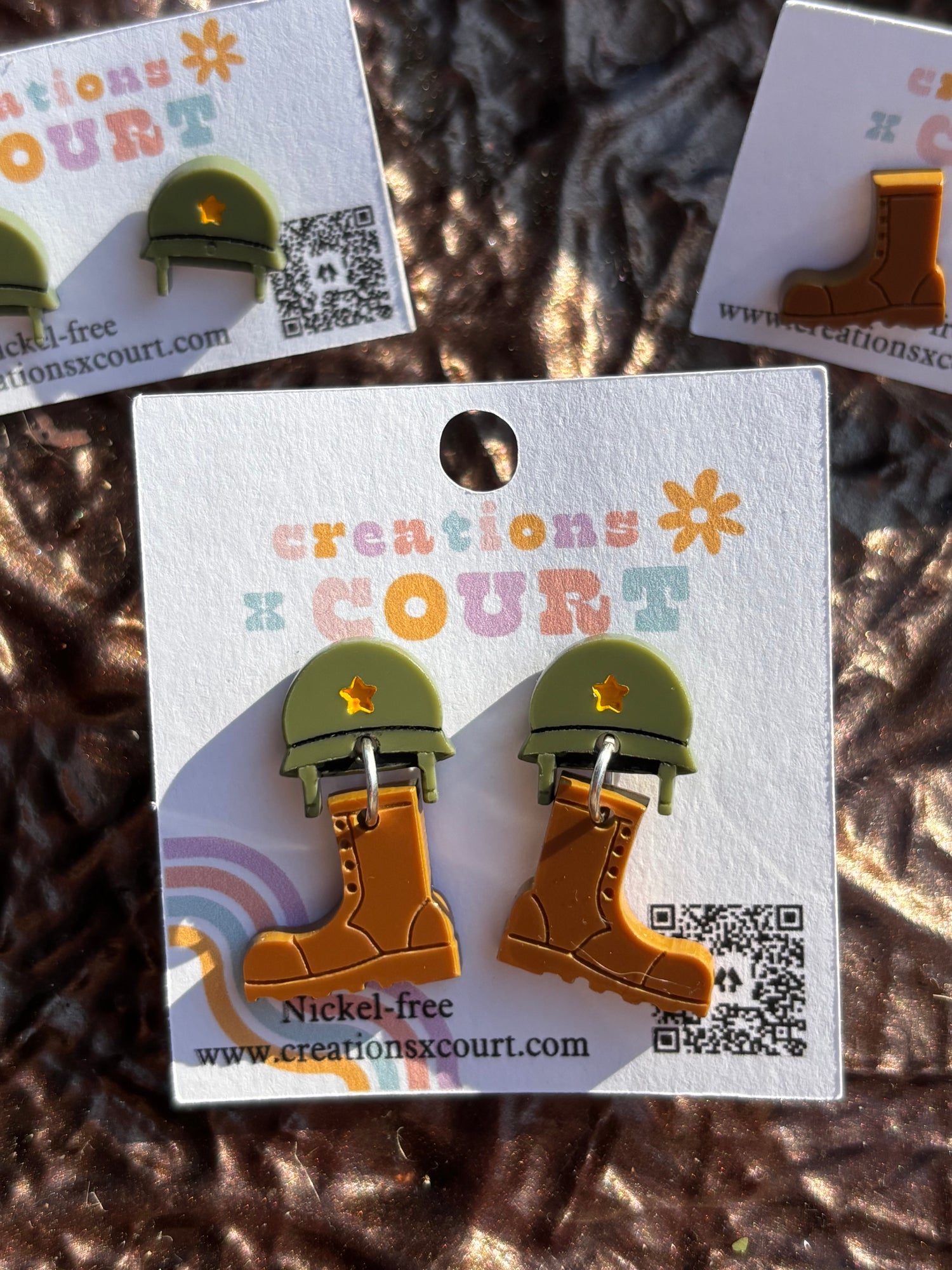 Rock your style with our playful Army Helmet + Boots Dangles and Studs! Handmade and nickel-free, these earrings are perfect for career day or adding a unique touch to any outfit. Stand out from the crowd and show off your quirky side with these super cute accessories!