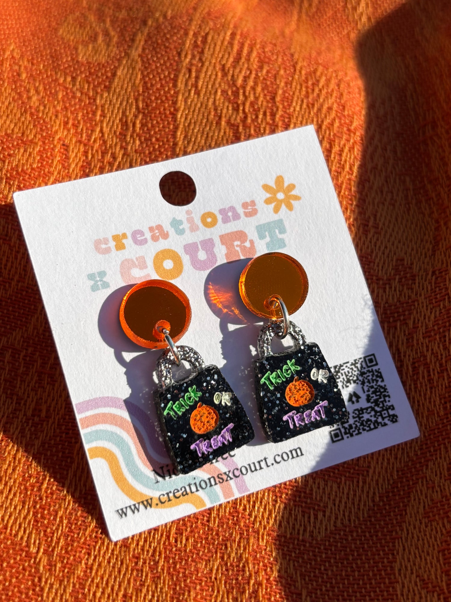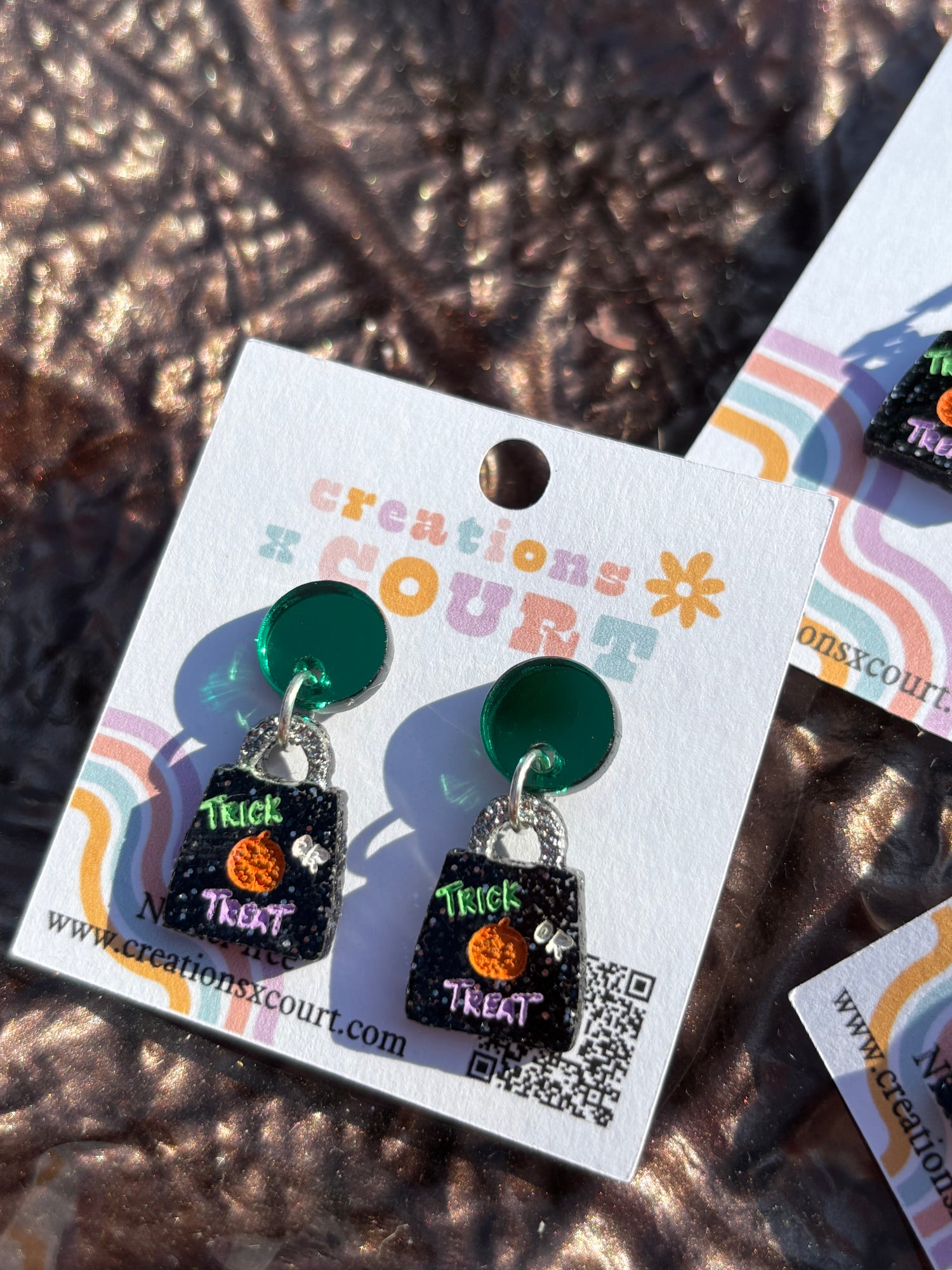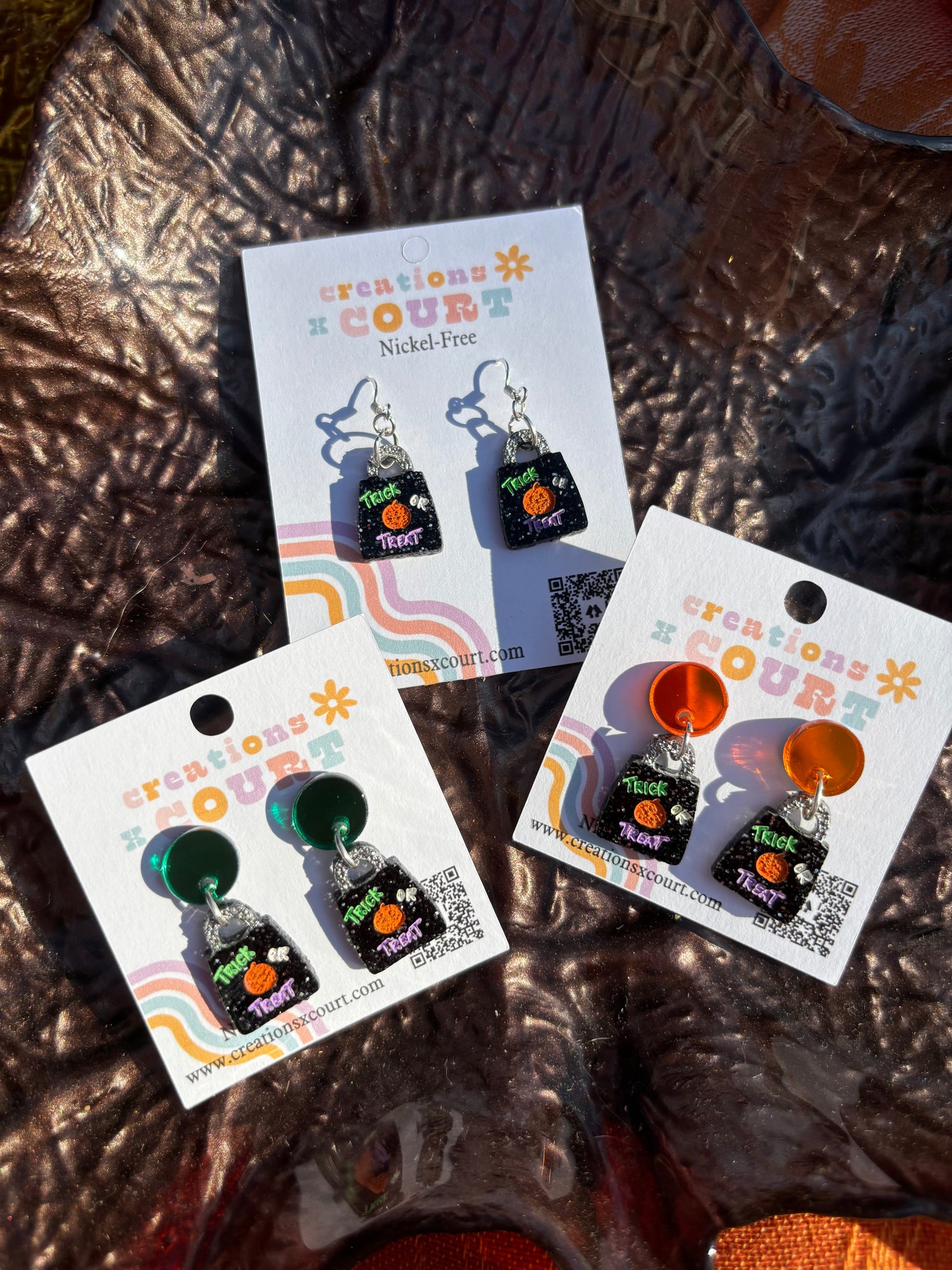 Add some spooktacular style to your wardrobe with these Trick or Treat Bag Dangles! These super cute earrings are the perfect accessory for Halloween, adding a touch of fun to any outfit. Get ready to trick or treat and turn heads with these playful and quirky earrings!