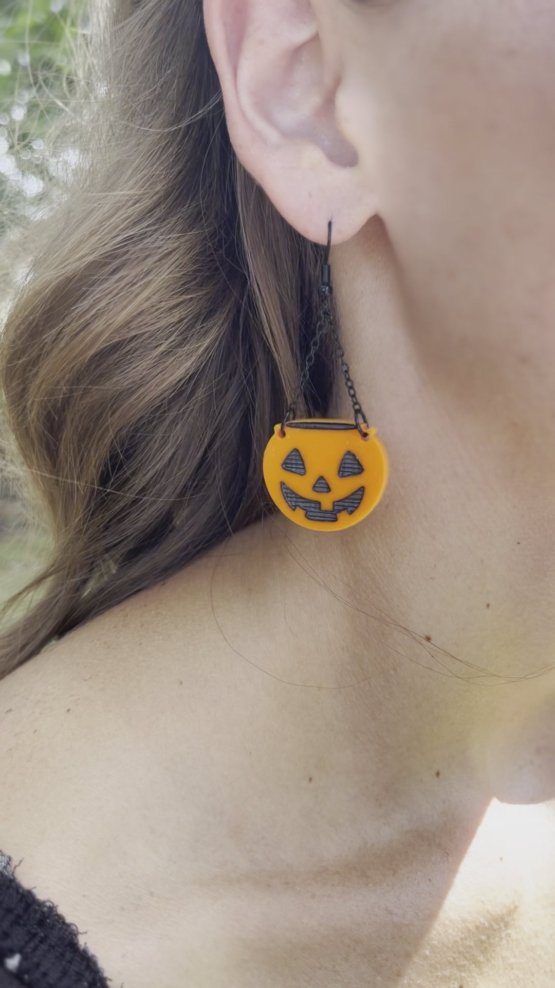 Get ready for spooky season with our Jack-O'-Lantern Bucket Dangles! Perfect for trick or treating, these handmade and hand painted earrings are hypoallergenic and lightweight. (No heavy pumpkin heads here!)